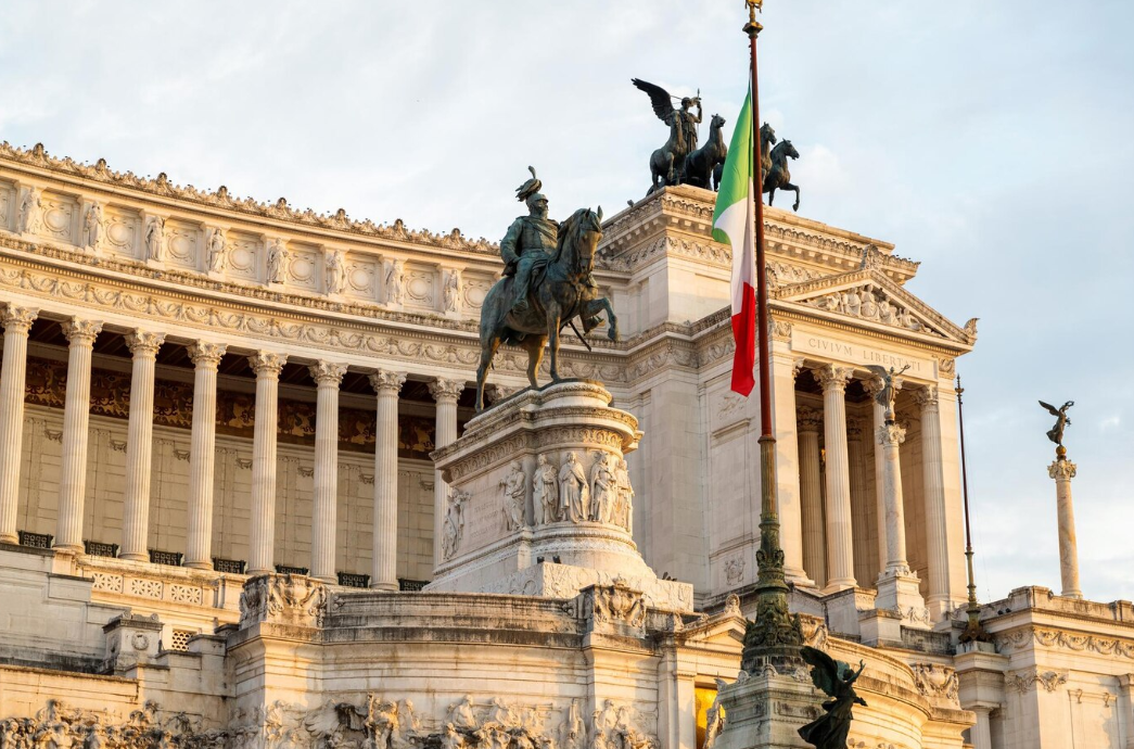 The Italian flag in front of a monument in Rome.
