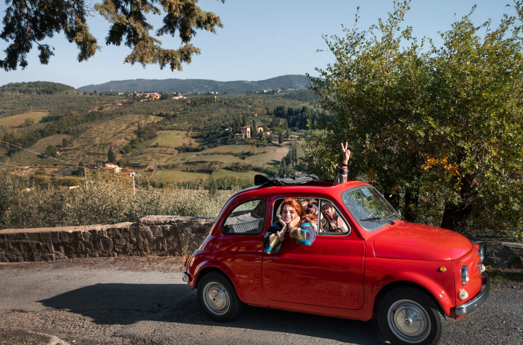 Driving a small car in the Italian countryside.