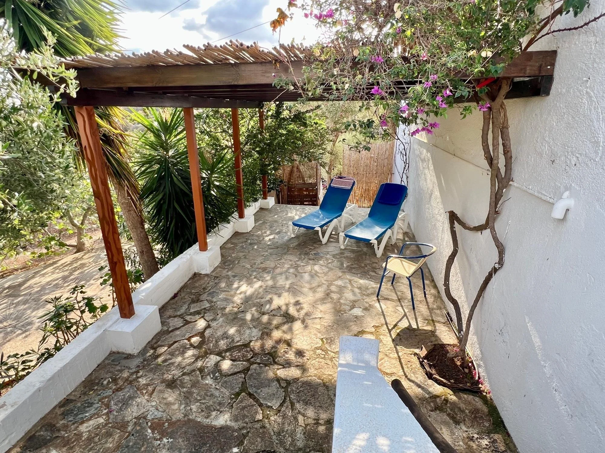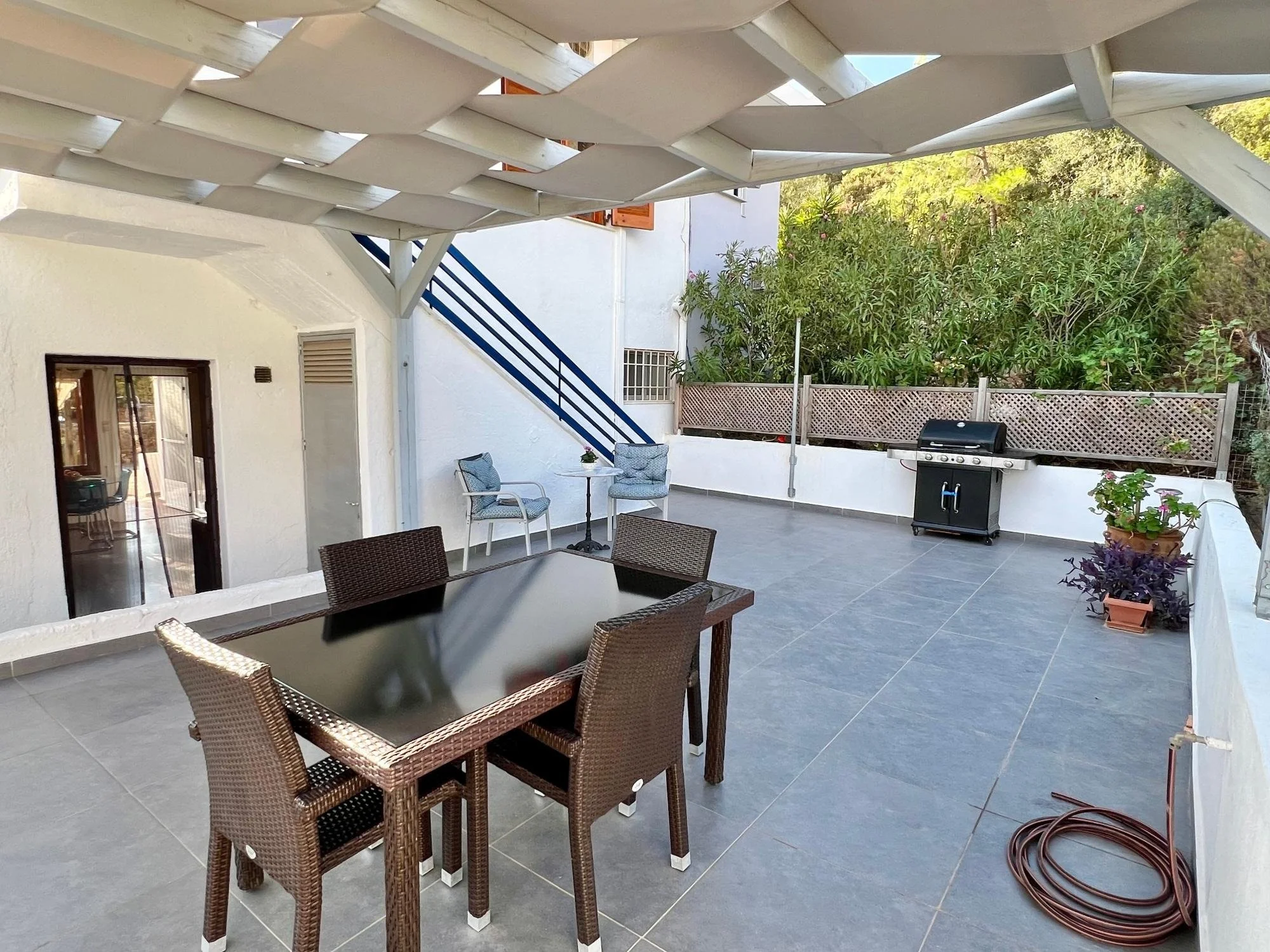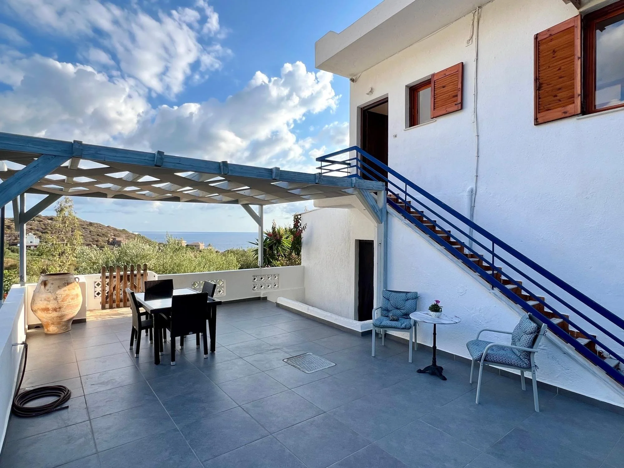 Next to the apartments entrances there is a large terrace with a pergola with dining table and four chairs.