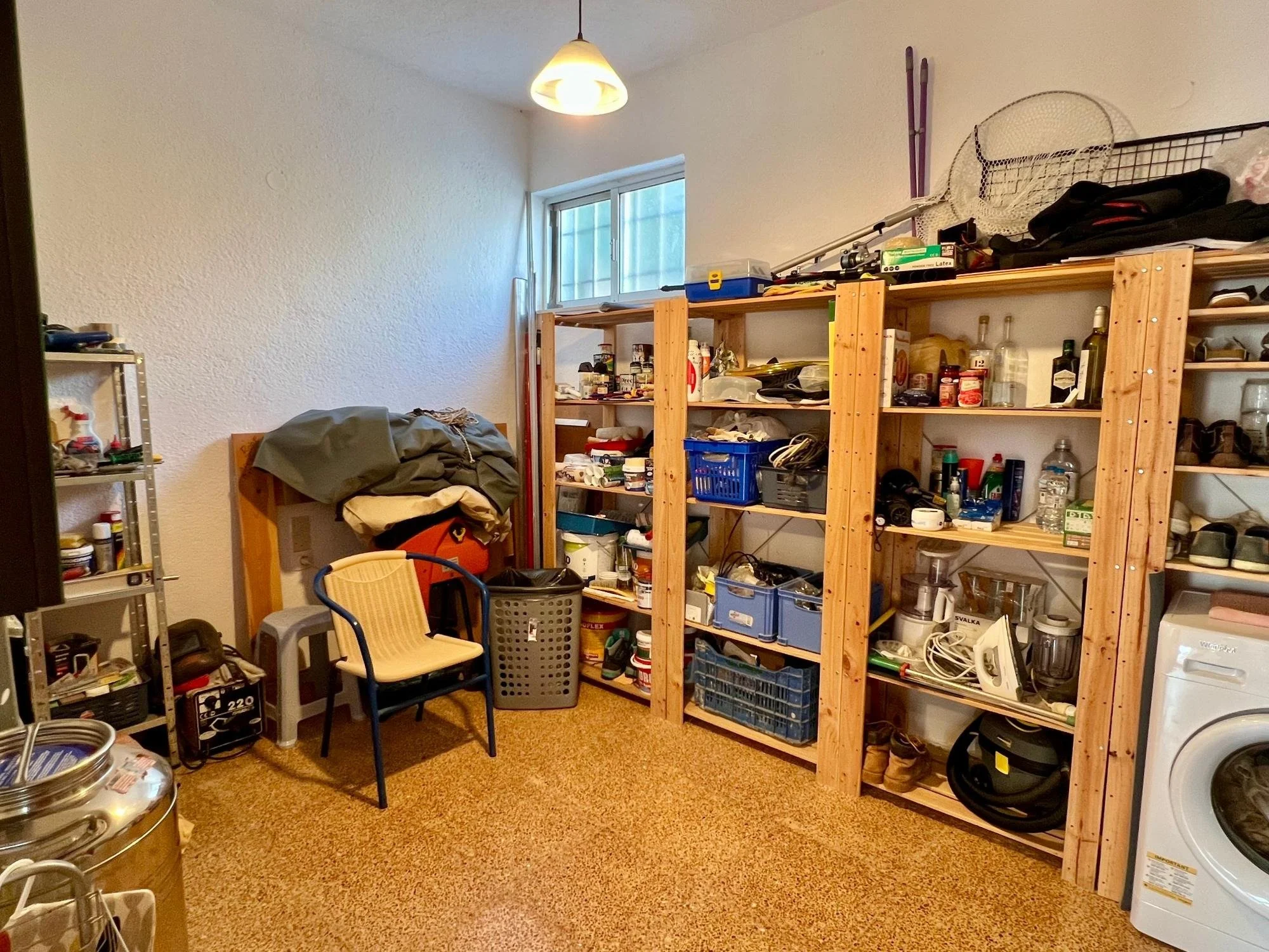 One of the ground floor bedrooms is currently used as a storage/utility room with shelving.