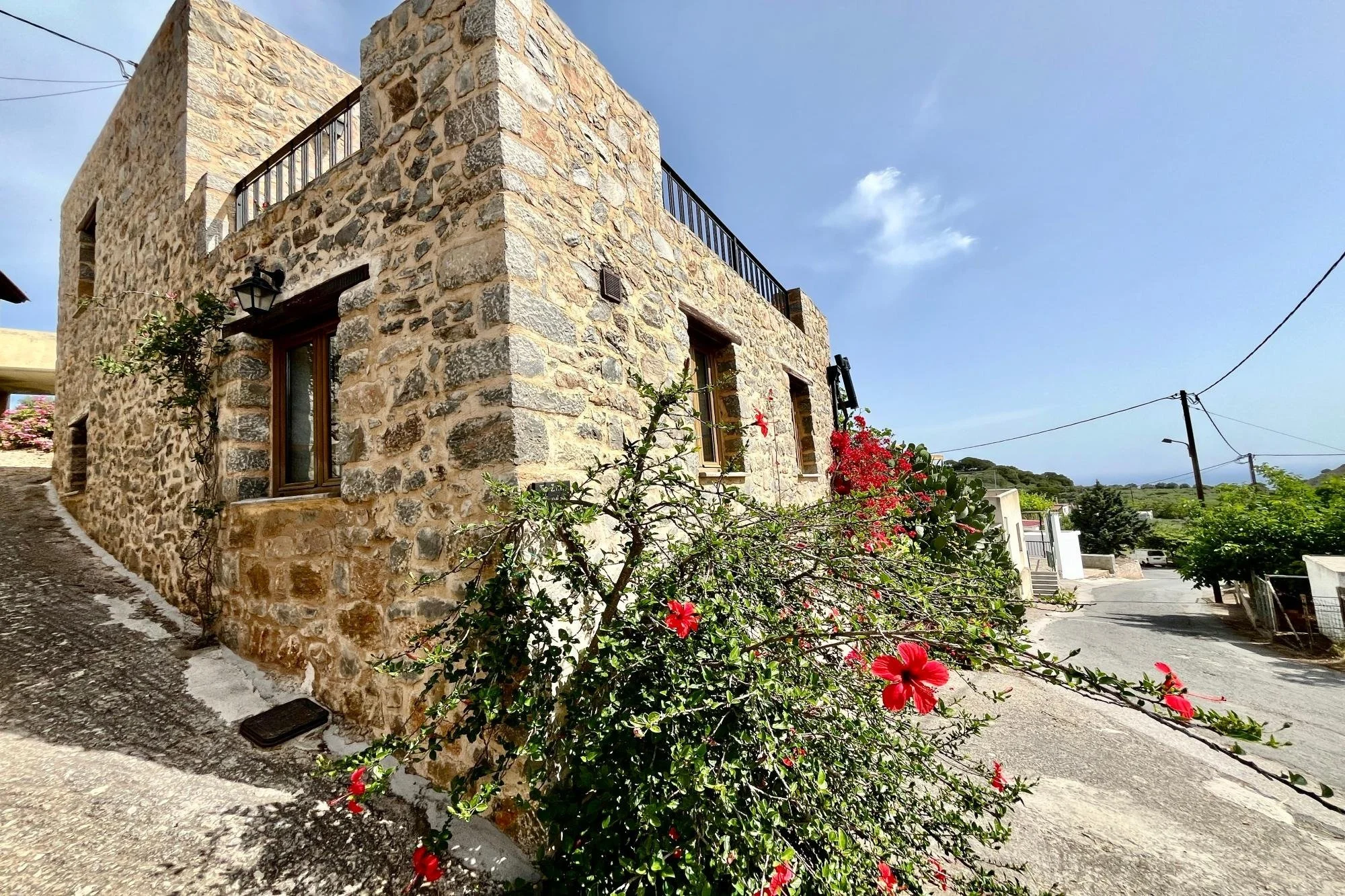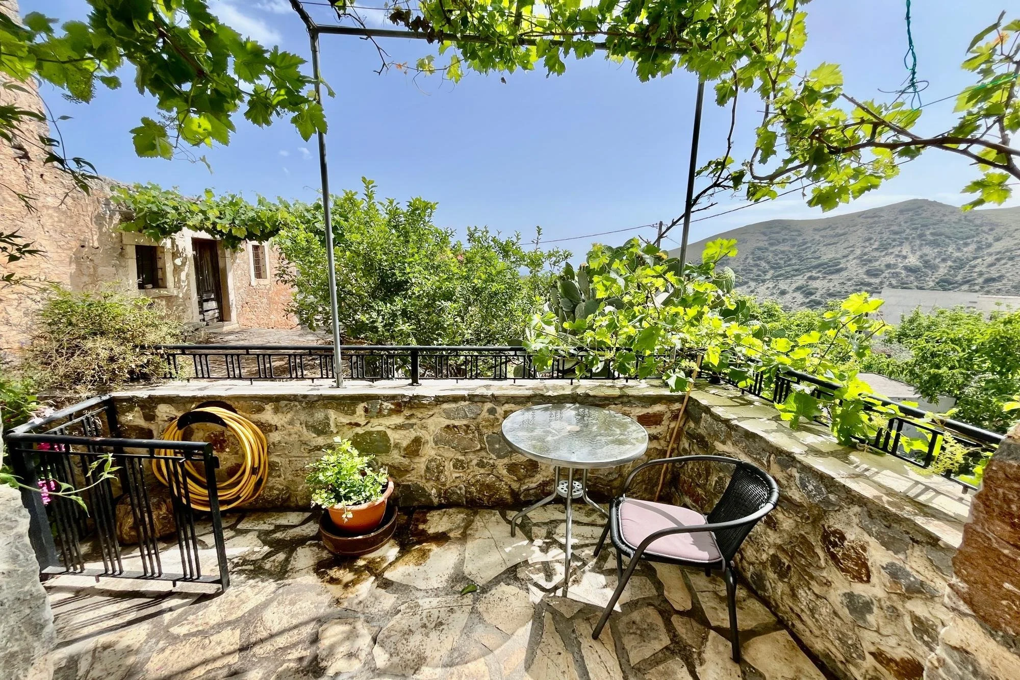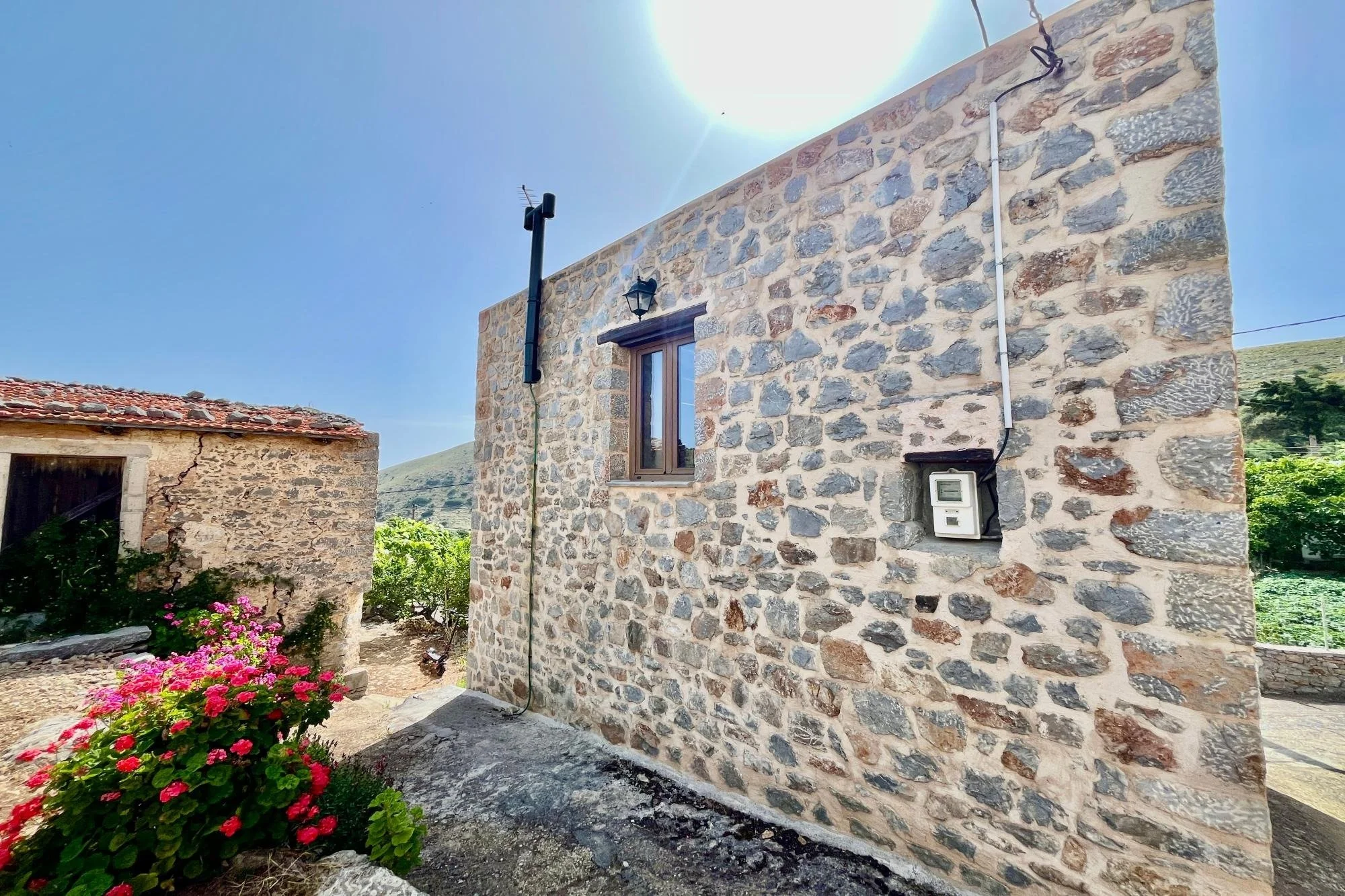 In the quiet village of Nofalias, this two-bedroom stone house feels like part of the landscape—simple, solid, and full of light. Old details like the arched stone hallway and wooden kitchen bring a sense of history, while the upstairs room opens to a wide terrace with views over the hills, the village rooftops, and even the sea. The garden just outside is full of life—lemons, pomegranates, herbs—and there’s space to breathe, unwind, and just live. It’s a home that’s ready when you are.