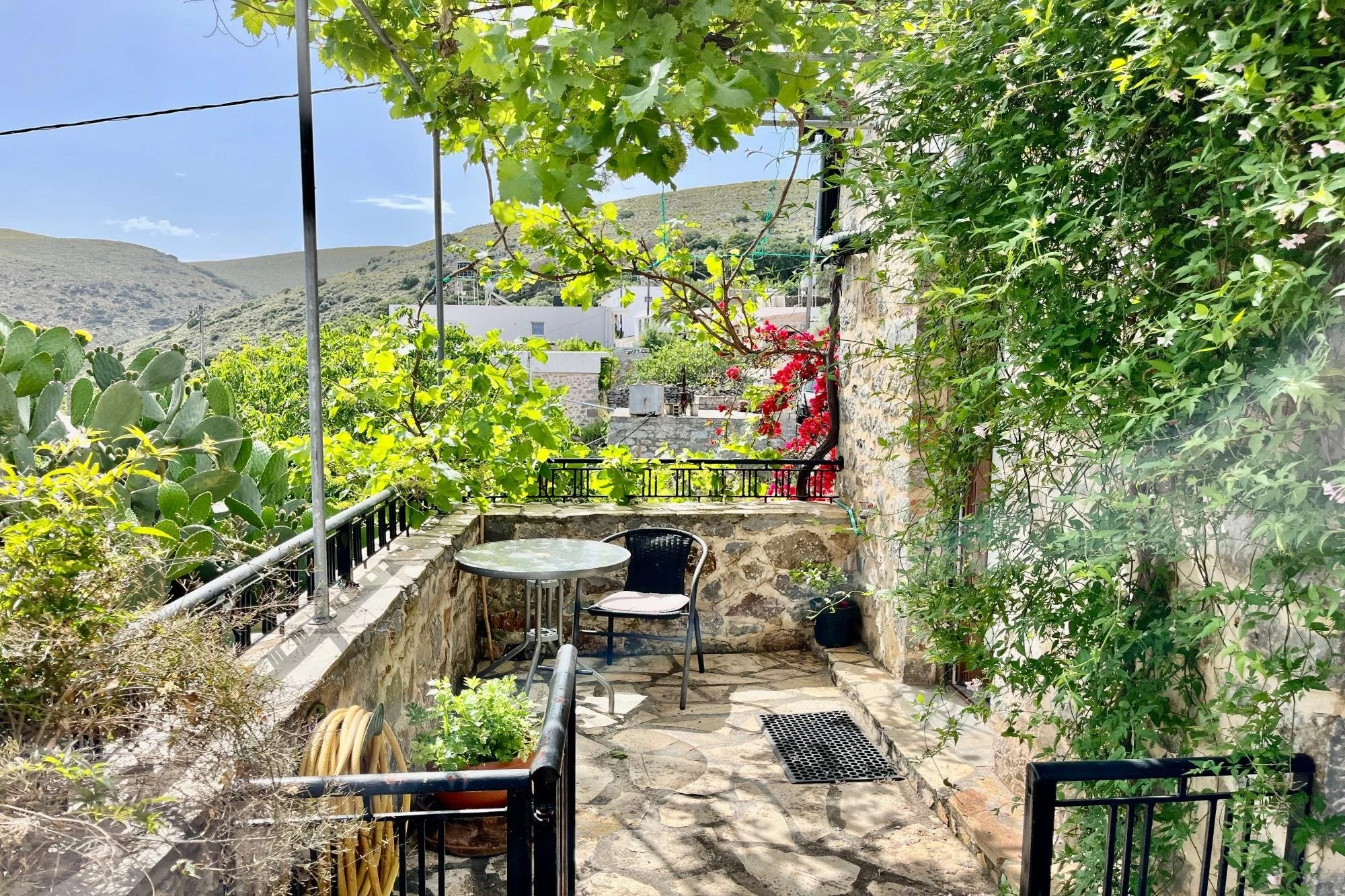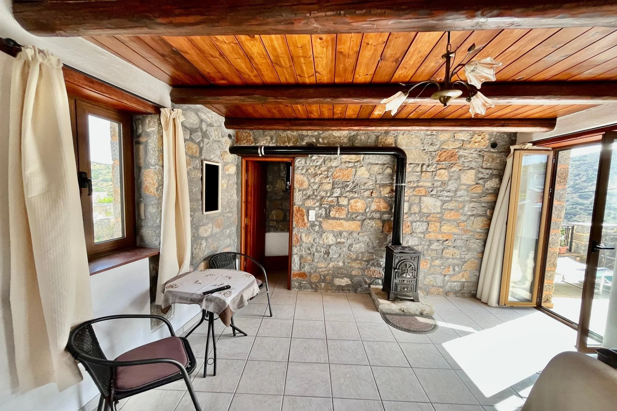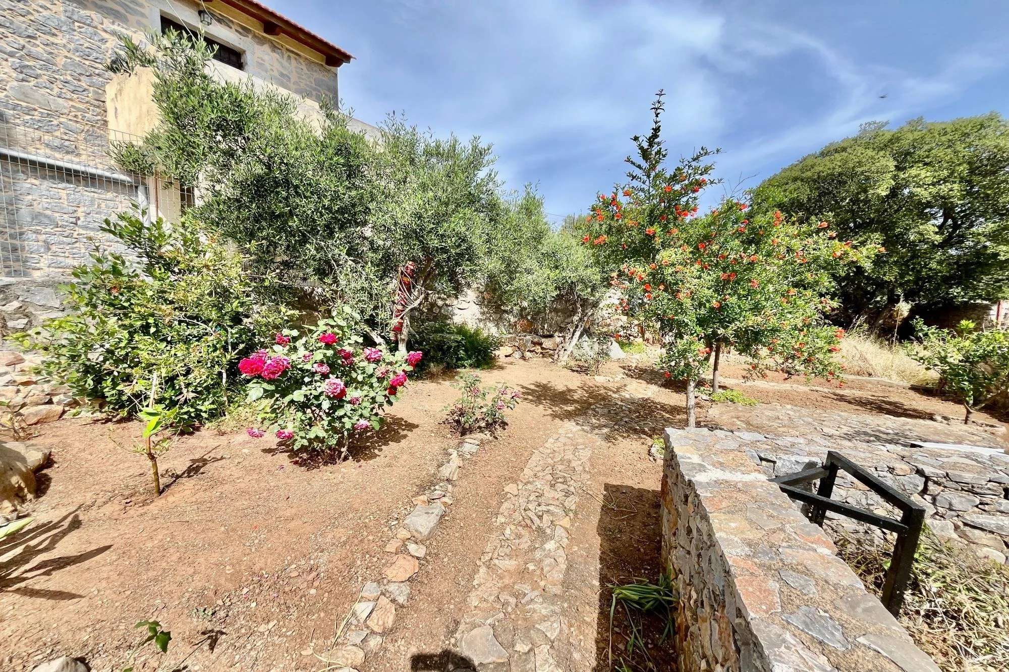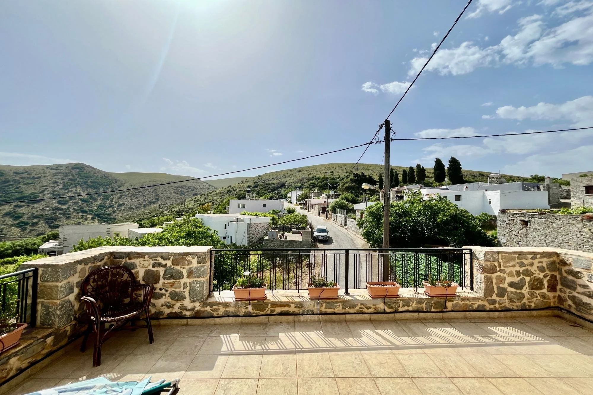 In the quiet village of Nofalias, this two-bedroom stone house feels like part of the landscape—simple, solid, and full of light. Old details like the arched stone hallway and wooden kitchen bring a sense of history, while the upstairs room opens to a wide terrace with views over the hills, the village rooftops, and even the sea. The garden just outside is full of life—lemons, pomegranates, herbs—and there’s space to breathe, unwind, and just live. It’s a home that’s ready when you are.