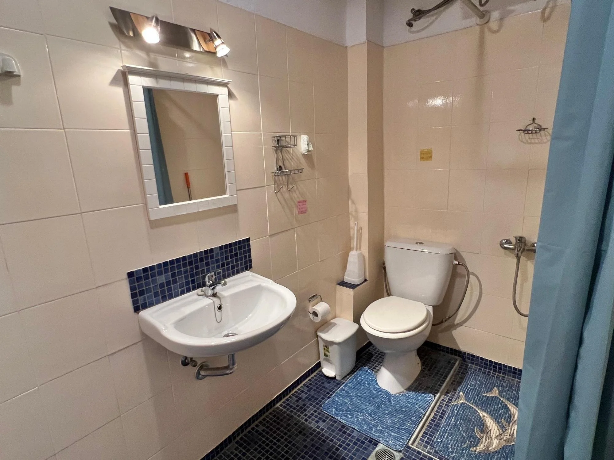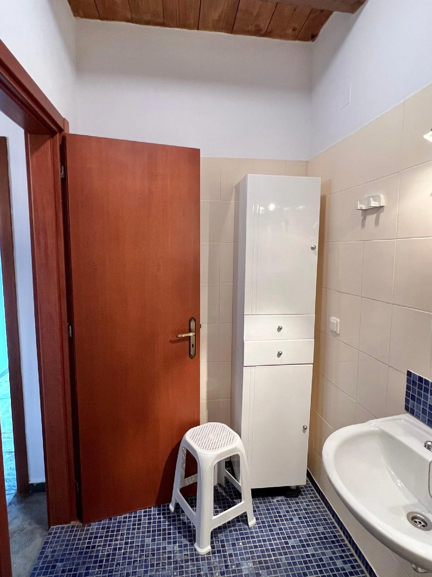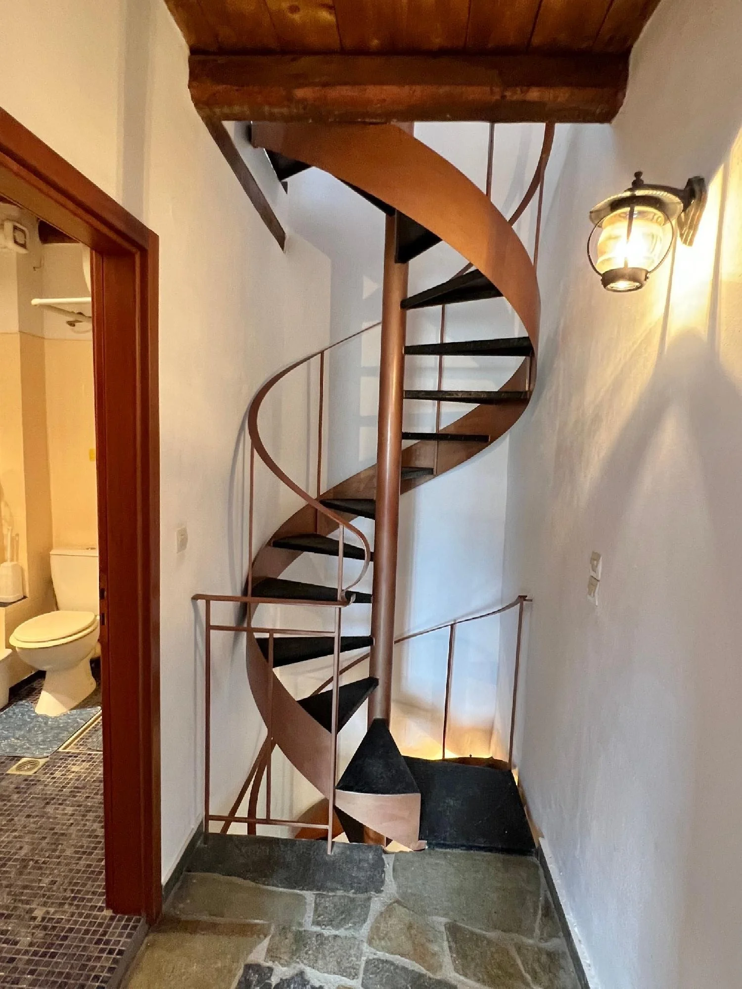 An internal iron staircase leads up to the 1st floor, where there is a double bedroom with window and a bathroom with shower, sink, toilet and water heater.