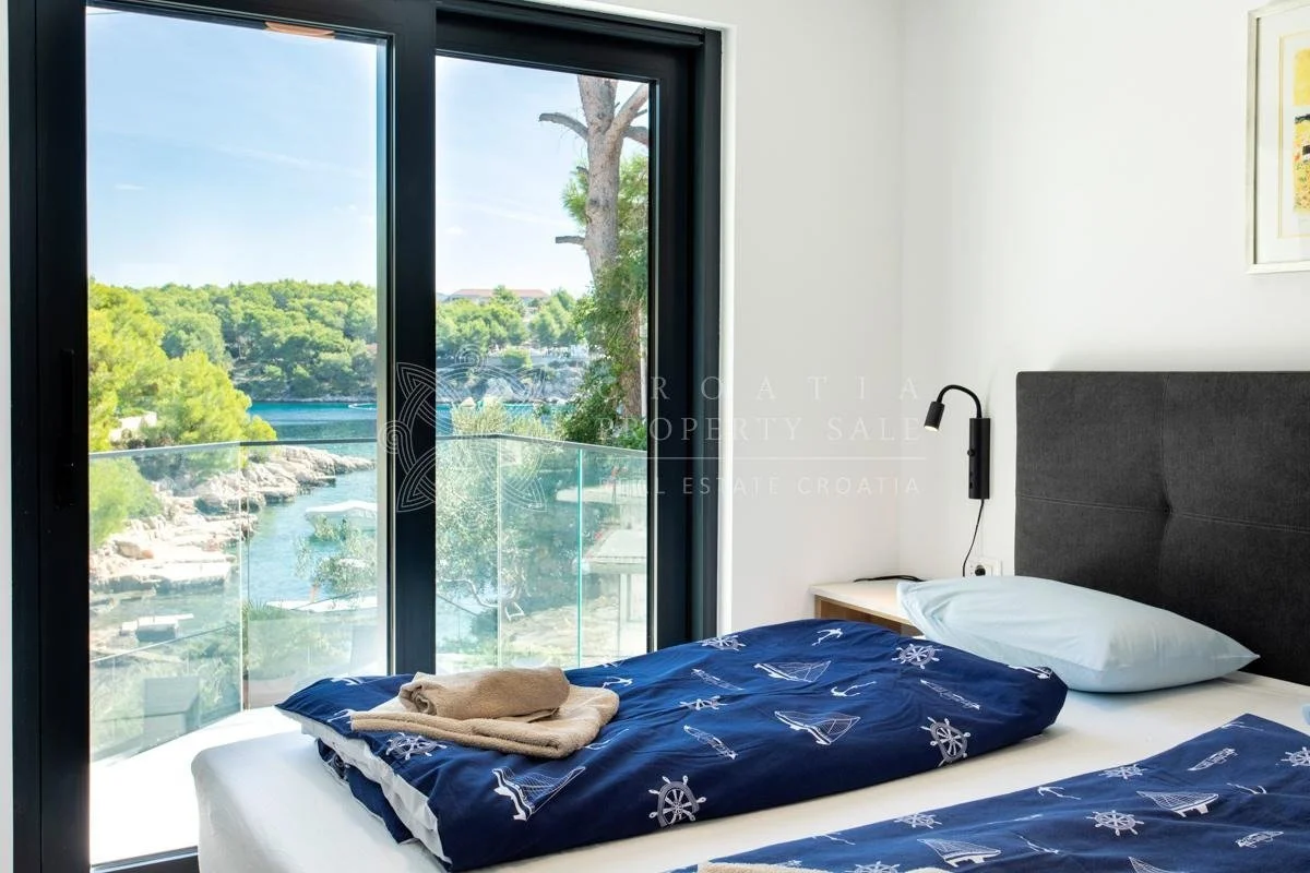 This newly built seafront villa on Brac Island offers an uninterrupted connection to the sea, with nothing between you and the water but sunlight and salt air. Each of the four bedrooms opens to a private balcony where glass railings keep the panoramic views wide open—even from the bed. Inside, the design is thoughtful and refined: spacious bathrooms with natural light, seamless indoor-outdoor flow, and a light-filled living area that opens to a teak-lined terrace and saltwater pool. Quiet, private, and fully furnished, this is modern island living at its most effortless.