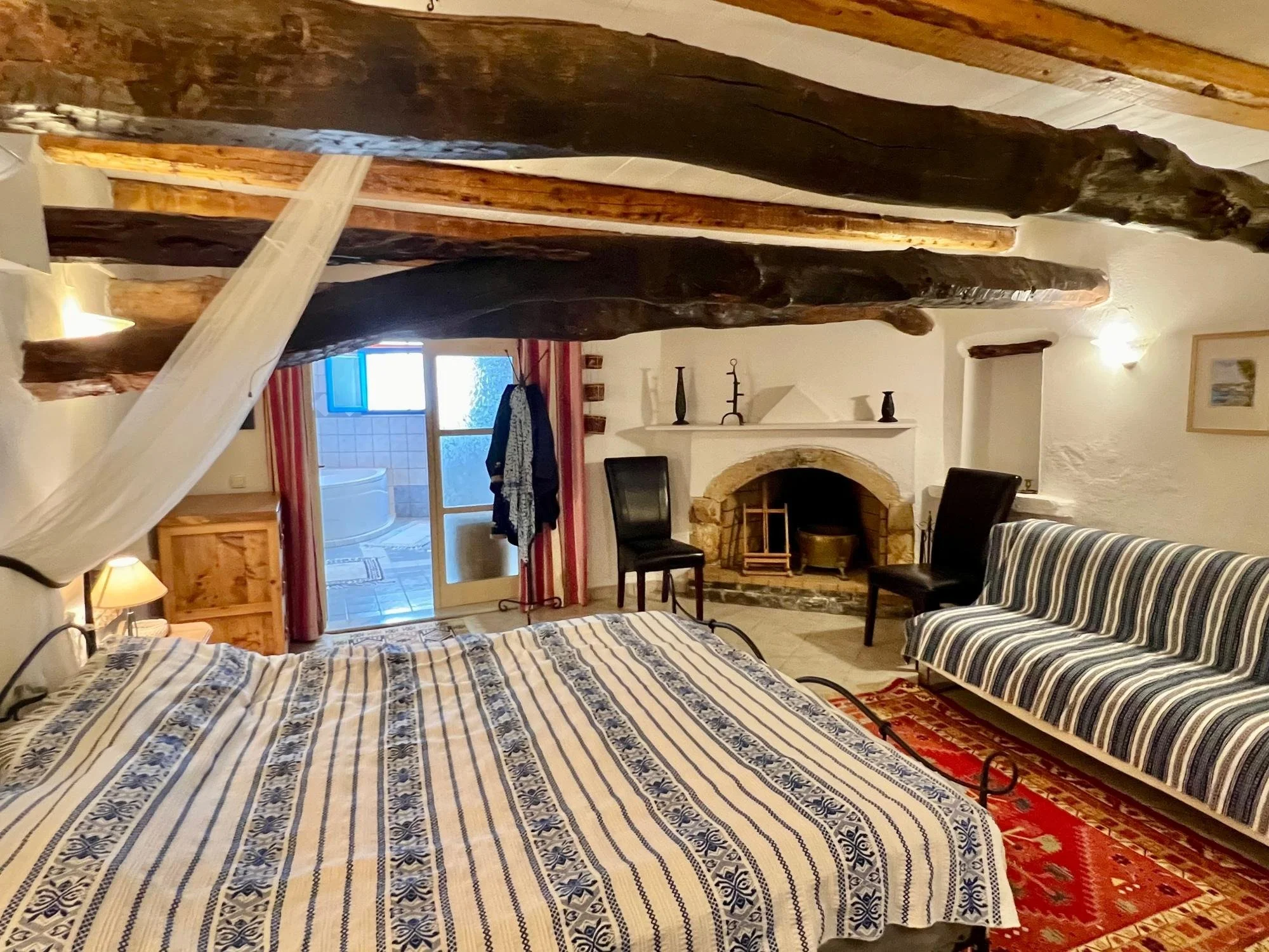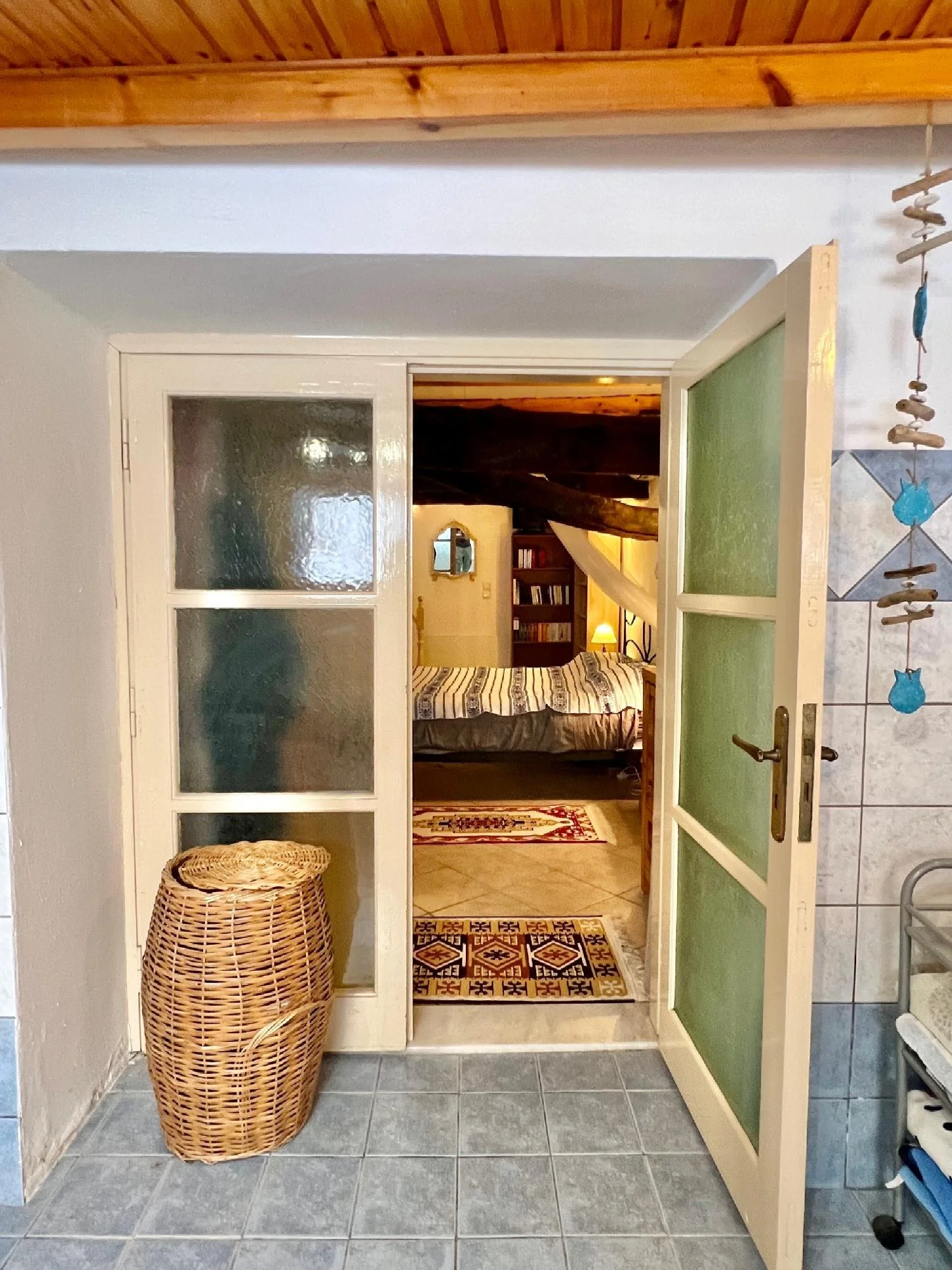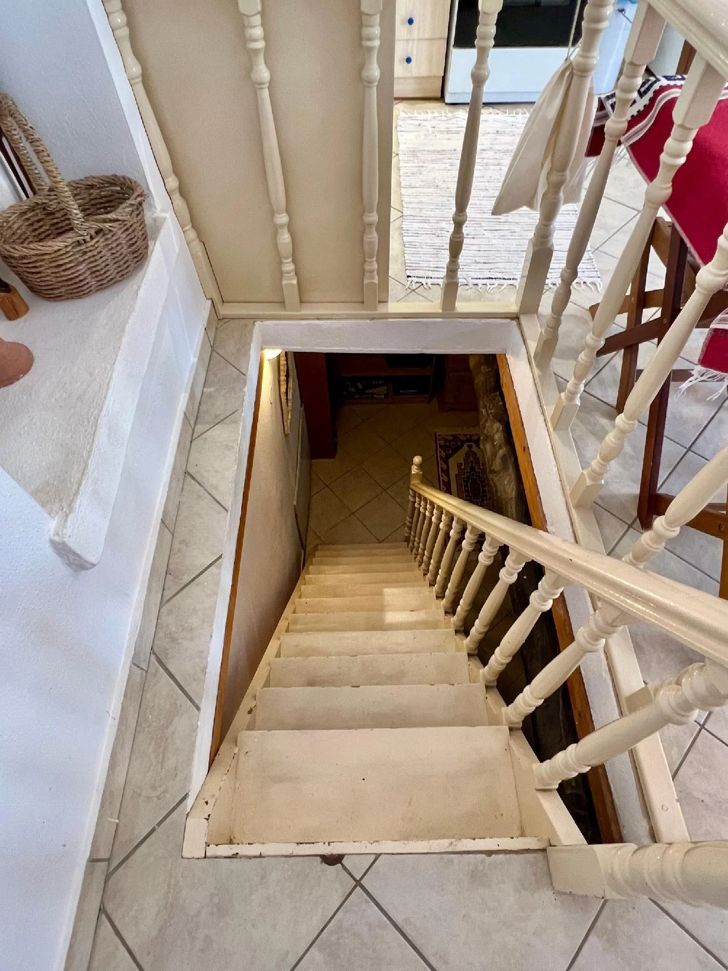 Αn interior staircase leads to the lower level where there is a large bedroom of about 30 m2 with a nice wooden ceiling and the original fireplace.