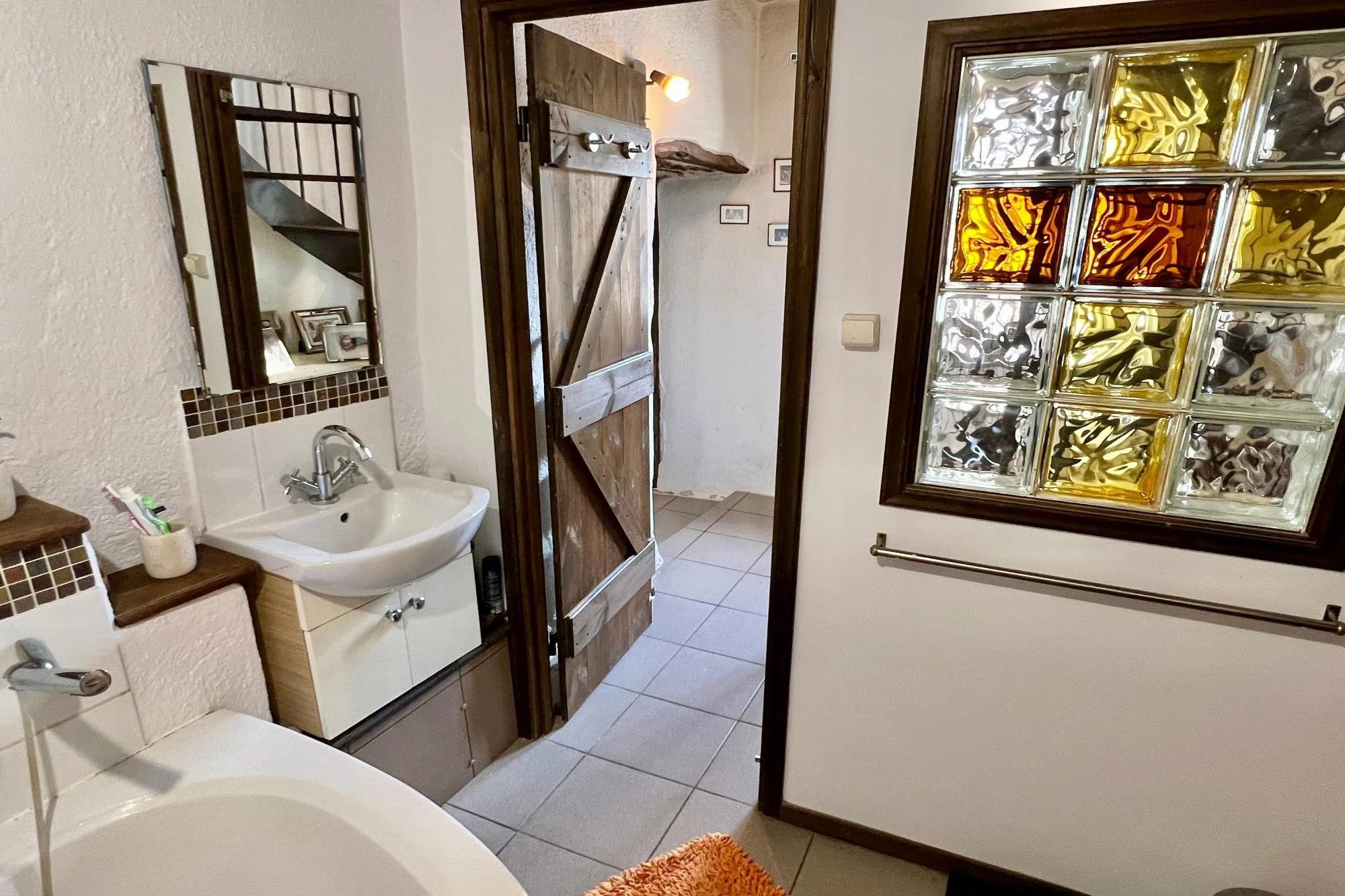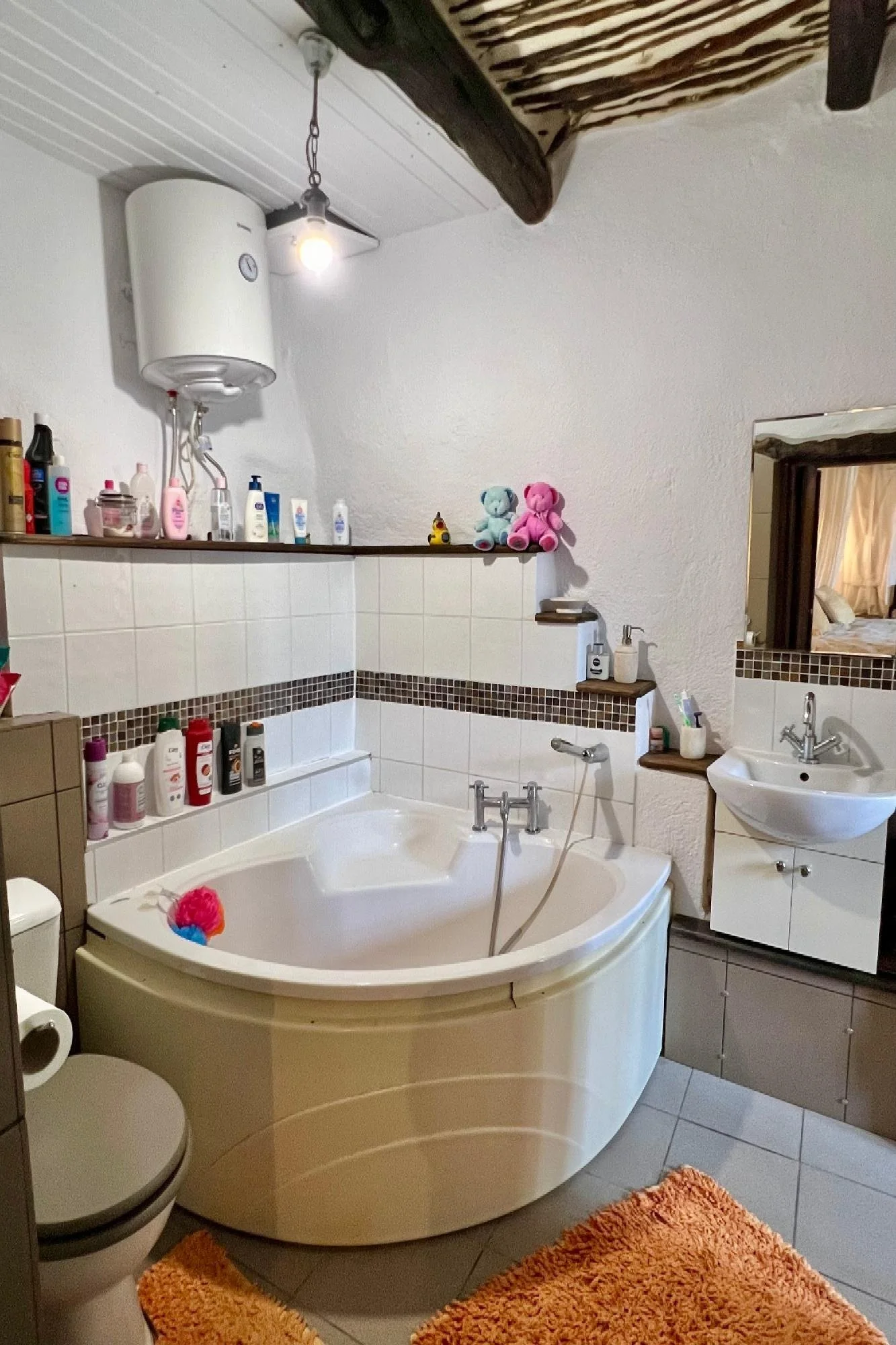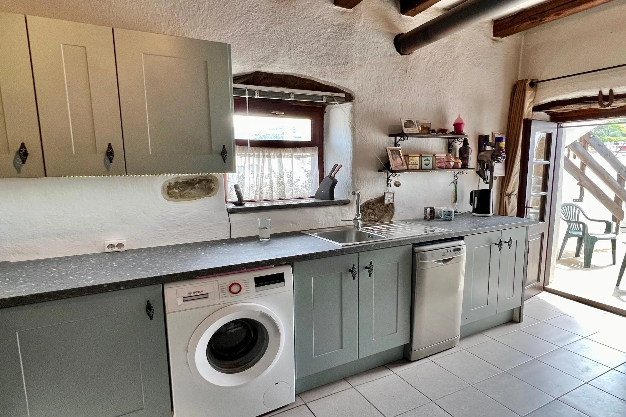 An internal staircase leads up to the top floor where there is a living room with a dining area and access to the front terrace which offers great views of the valley and the villages below. There is also a side covered terrace used as a utility room.