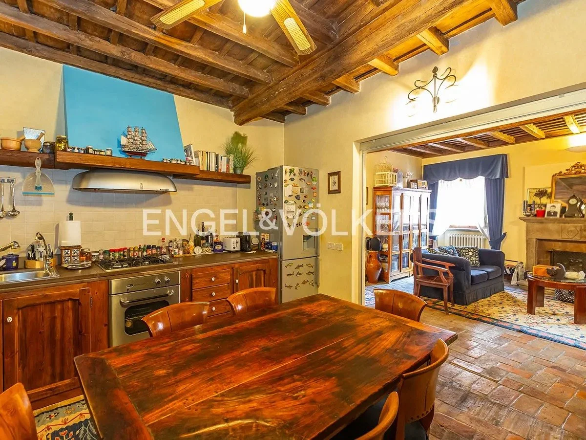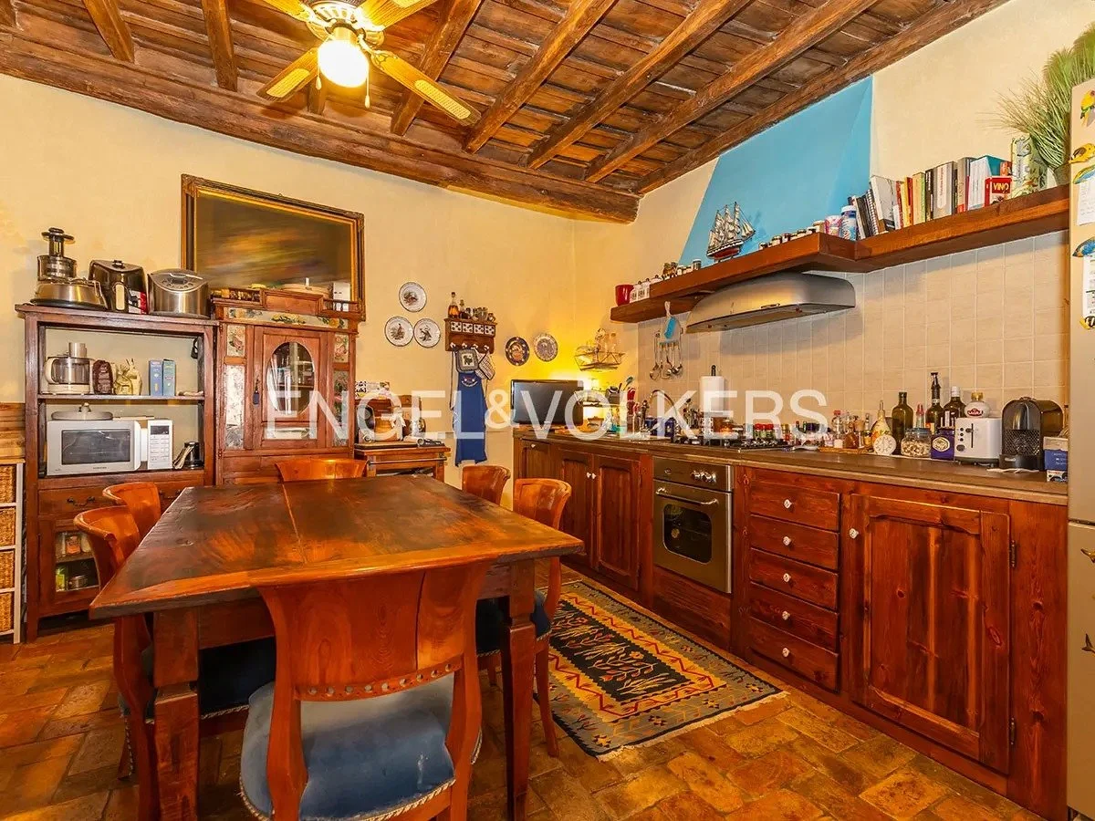 In Vetralla, on the main street of the historic center inside a 16th-century building, Engel & Völkers offers for sale a renovated apartment of about 200 sqm with a terrace. The atmosphere is welcoming and private, with pleasant views and double-glazed windows, exposed beams, and terracotta floors throughout the house. Upon entering, we immediately find the living room enhanced by a peperino stone fireplace and the dining area surrounded by the cozy kitchen.