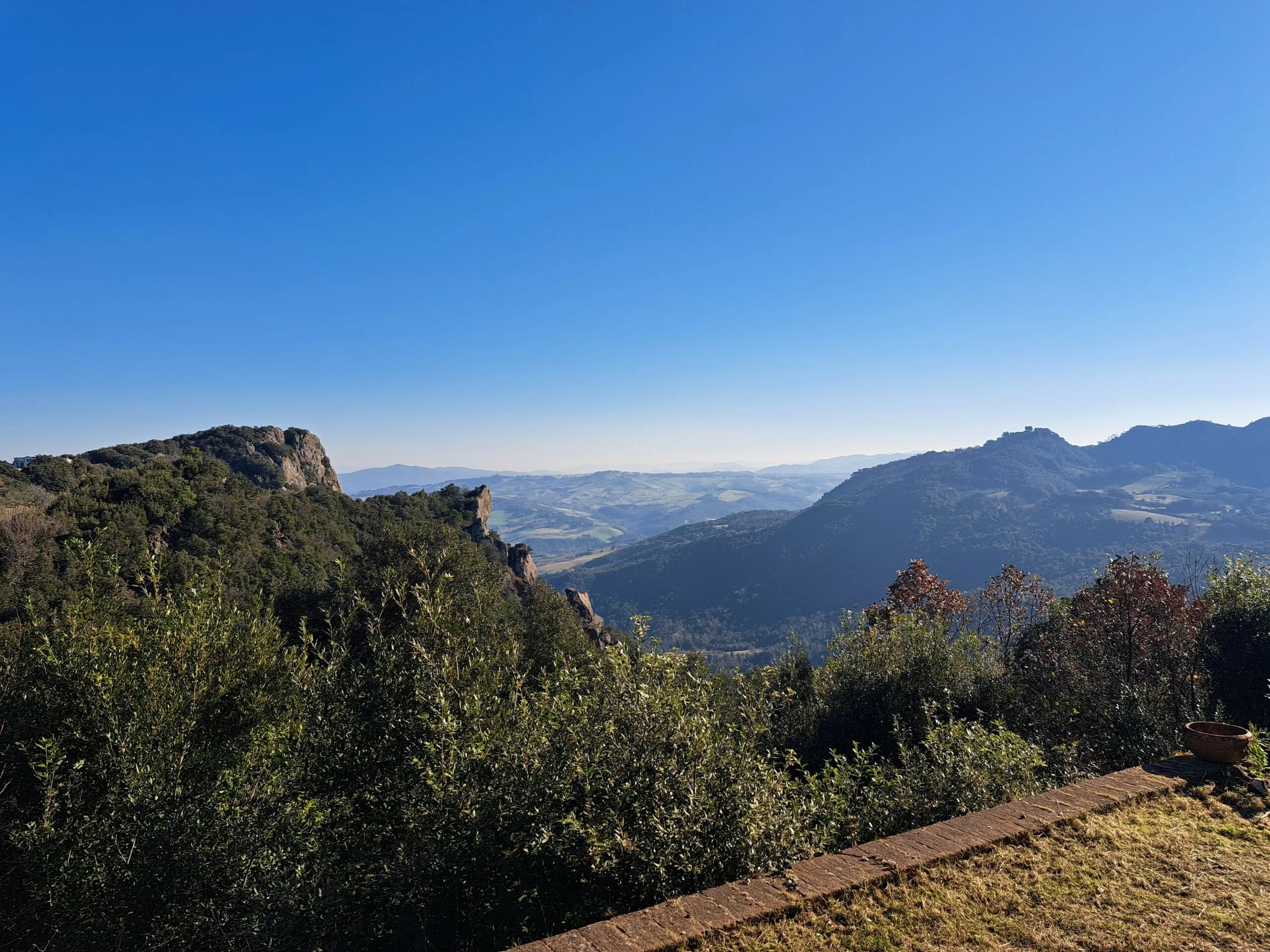 Tucked into the rolling hills of Pomarance, this petite countryside retreat offers soul-stirring views and a quiet rhythm of life. Just beyond a sleepy hamlet, the single-level home opens onto a covered loggia that feels suspended above the natural reserve, where sunsets stretch endlessly across the landscape. Inside, rustic beams and a wood-burning fireplace add warmth and character, while outside, over a hectare of private land invites future possibilities—be it a pool, an orchard, or simply space to breathe. Secluded but not remote, it's a rare blend of tranquility and convenience.