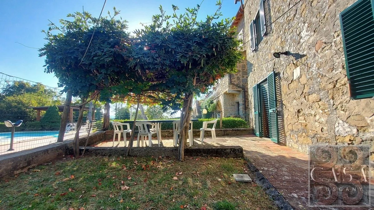 The property has original Tuscan style features such as terracotta floors, ceilings with chestnut wood beams and terracotta tiles, wooden fixtures, and aluminum shutters.