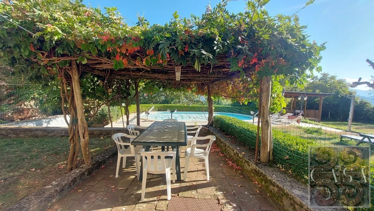 It has an outside area (about 50 sqm), partly paved and partly garden, with a beautiful vine pergola with a table and chairs, lovely for outdoor lunches and dinners with great views of the valley and surrounding hills.