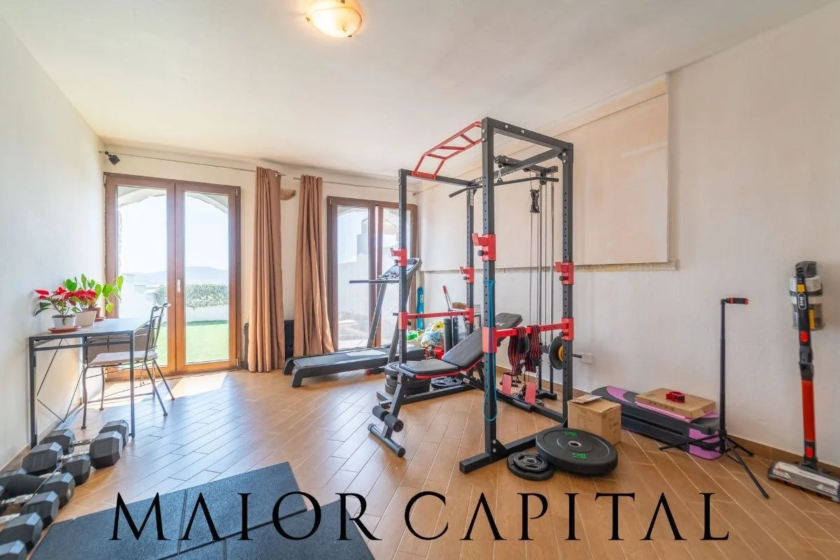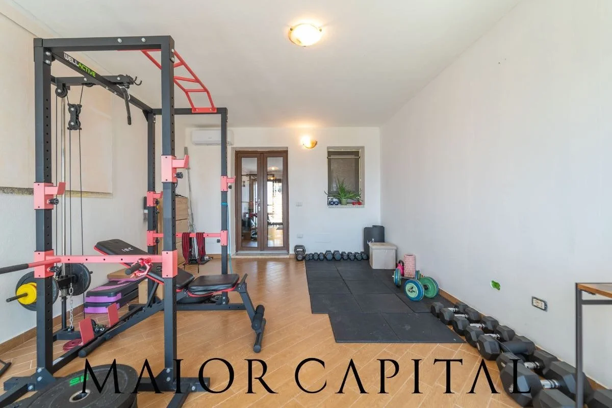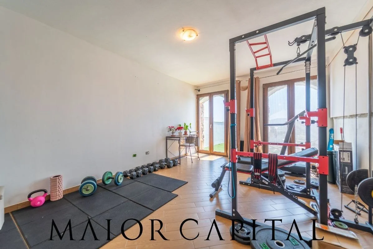 Also on the ground floor is a bathroom with shower and a covered veranda, now used as a gym but easily converted into a dining area, relaxation area or guest room.