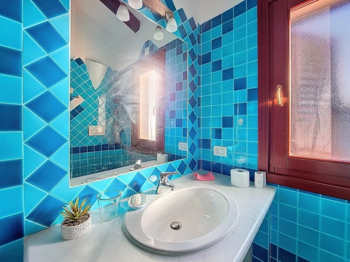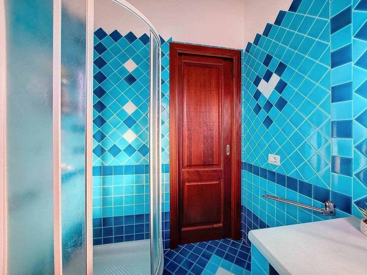 From the hallway we access the sleeping area where we find the bathroom with shower. The blue bricks add a touch of style and refinement giving the bathroom a fresh and contemporary appearance.