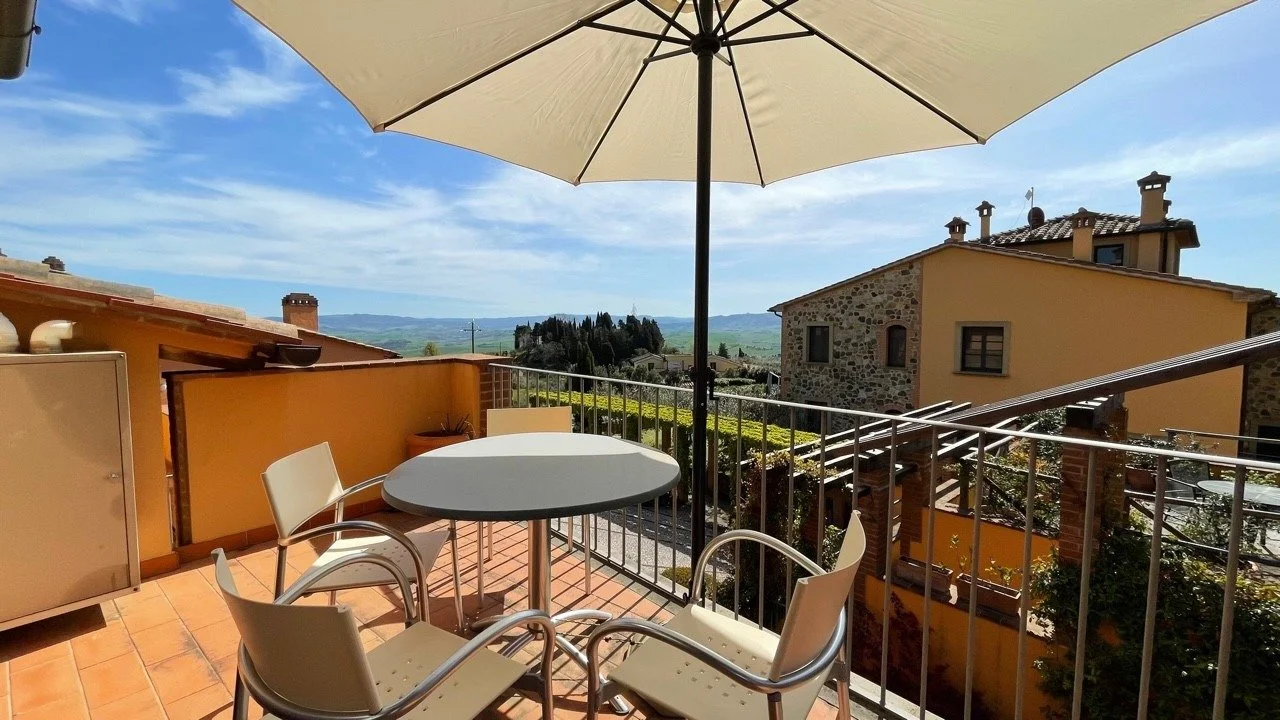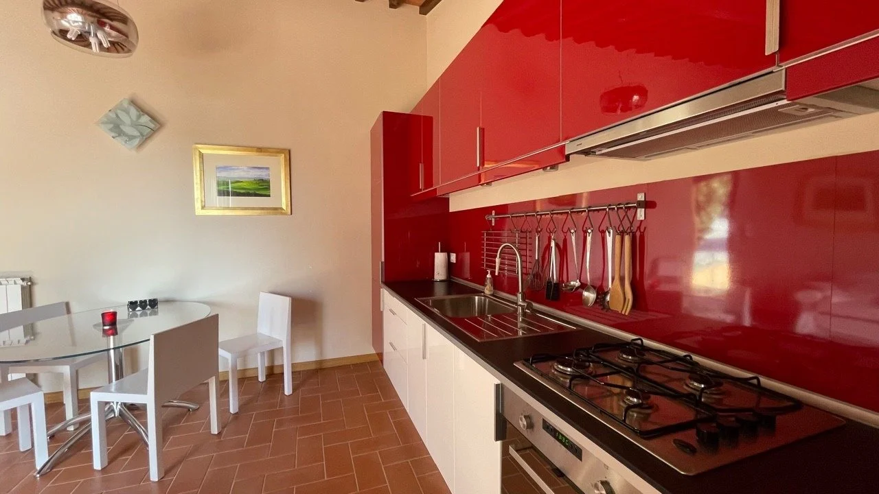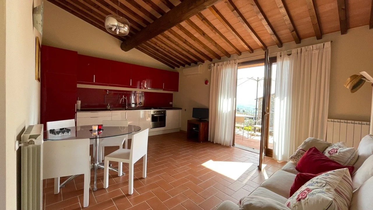 Bathed in golden Tuscan light, this beautifully kept apartment in the hilltop village of Orciatico offers sweeping views toward Volterra and the iconic Teatro del Silenzio. The interiors blend timeless elegance—like terracotta floors and beamed ceilings—with modern comfort, creating a warm and airy retreat. With a private terrace for dining al fresco, access to a shared pool, and a peaceful setting just a short drive from cultural landmarks and the coast, it’s an ideal base for quiet escapes or summer gatherings.