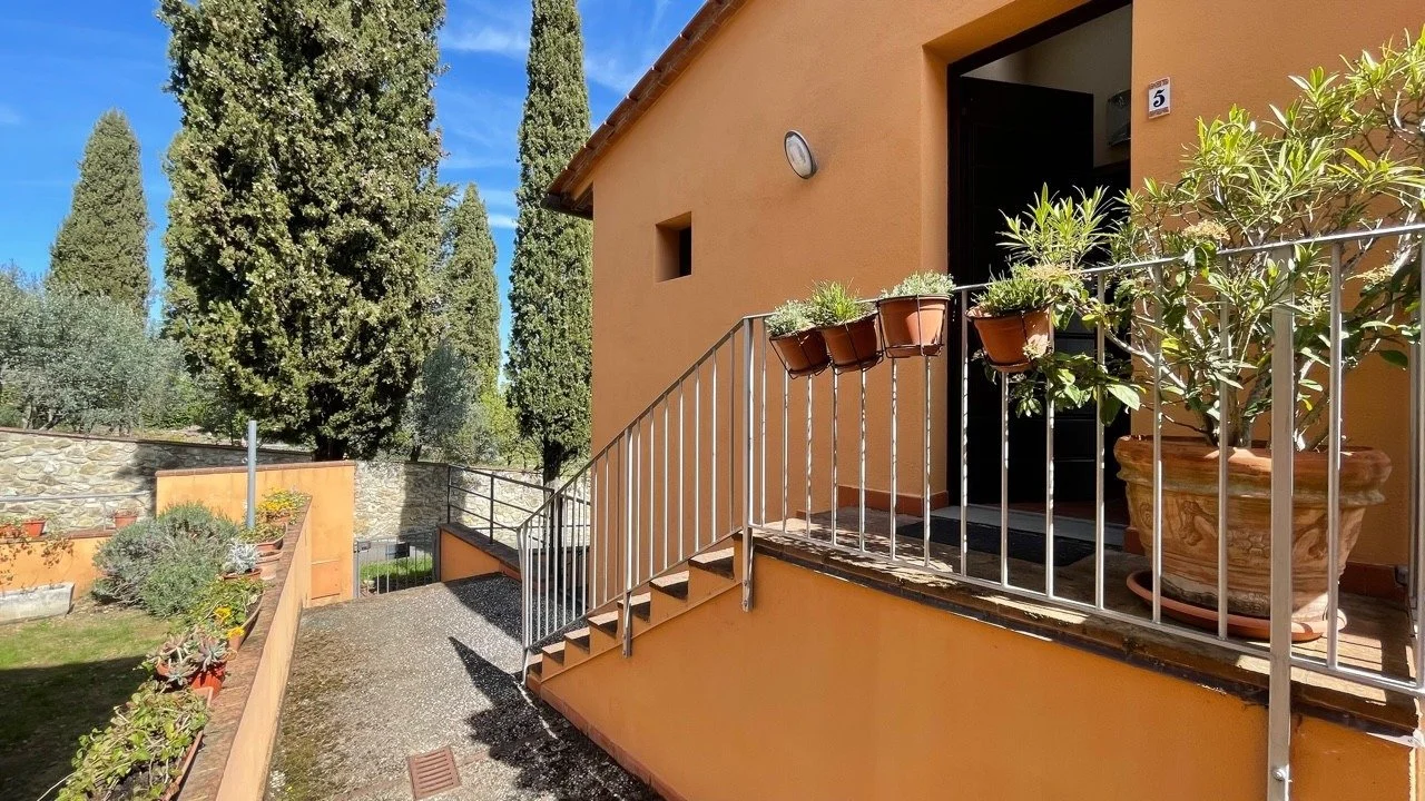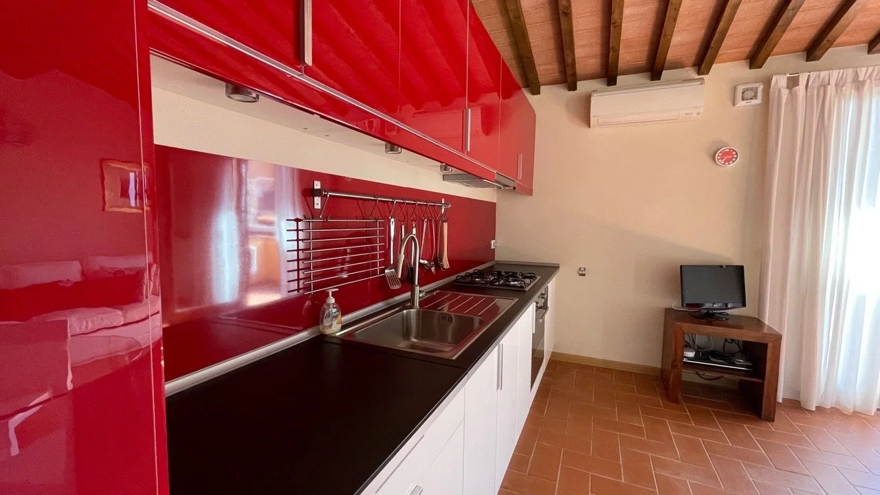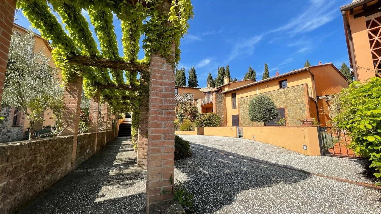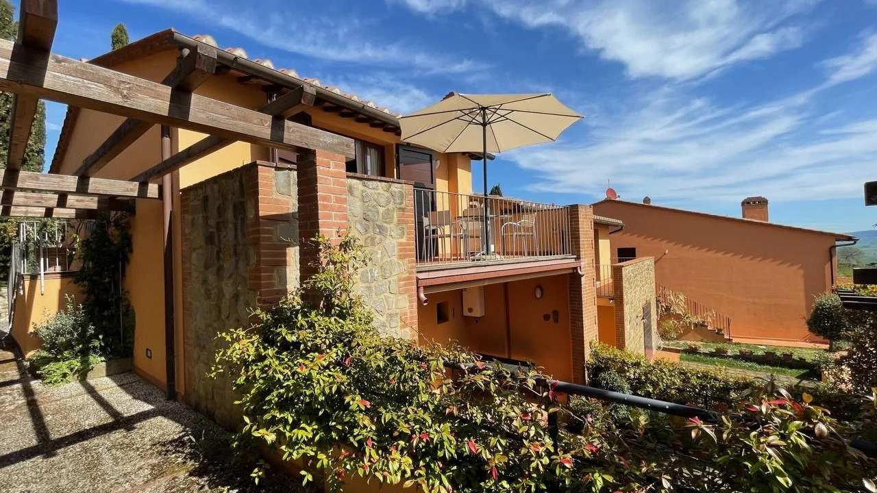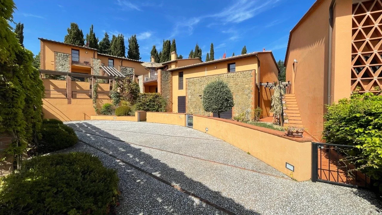 Truly charming apartment for sale in Orciatico, Tuscany, Italy, on the first floor of a two storey building within a beautiful residential complex of 13 apartments, with a private car park and shared swimming pool.