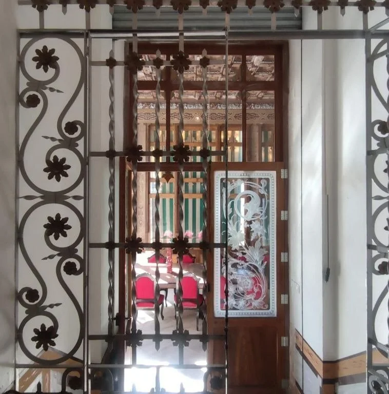 The mansion is U-shaped and is built with load-bearing masonry stone walls and wooden joist floors. It has more than 630m2 of built surface distributed on two main floors. The ground floor with a surface of 378m2, has a large entrance with covered patio, spectacular living room with rear exit. In the south wing there are three main rooms, one of them a spectacular modernist style living-dining room with wooden coffered ceiling, and another room that gives access to a bedroom with its own bathroom, and the third, which is currently a library, is accessed through a small living room, and also has a small office.