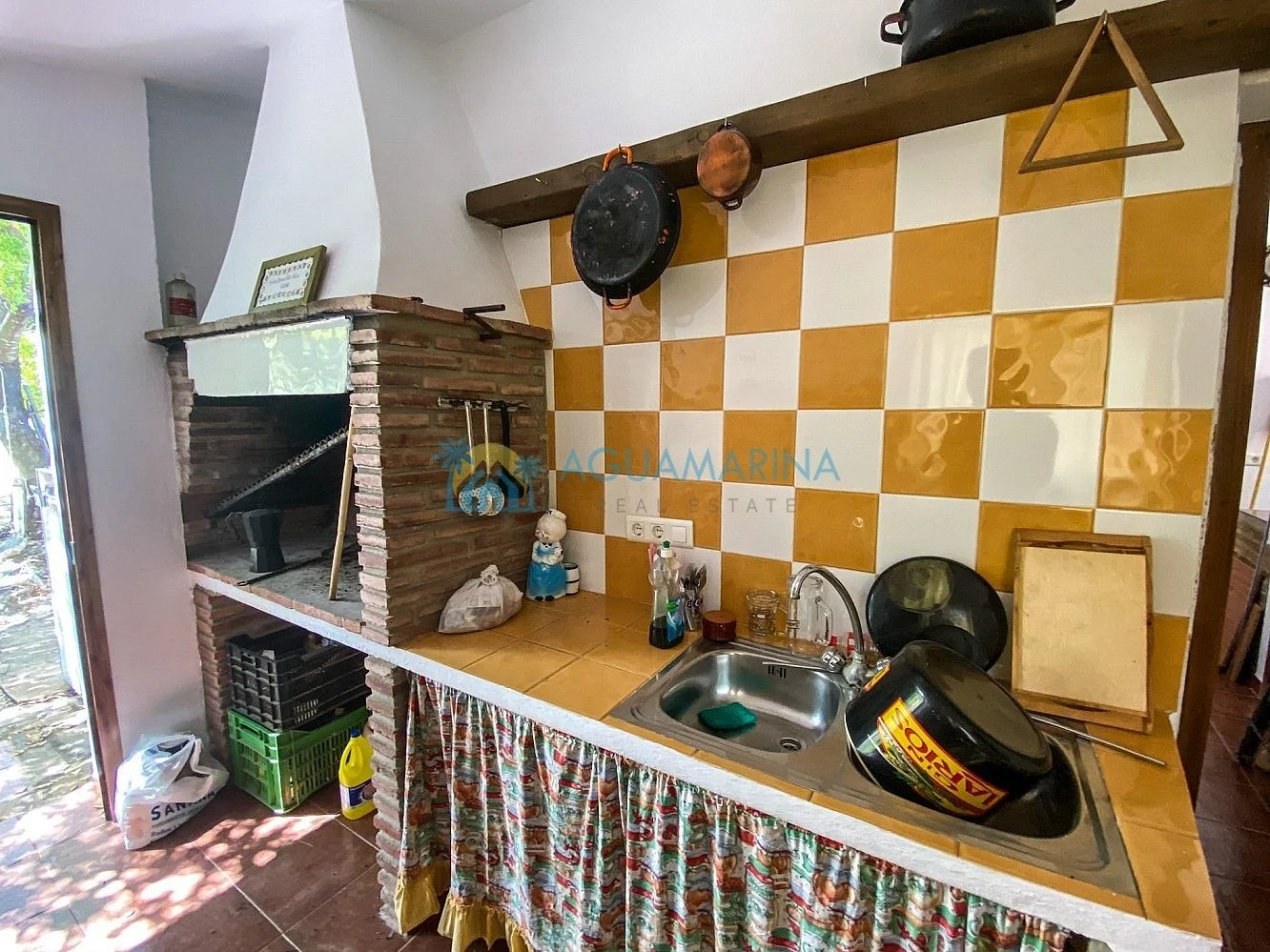 The building is in the Andalusian farmhouse style and consists of a pergola-covered terrace, a living room with a fireplace, a bedroom, two kitchens, one with a wood-burning oven, and a bathroom.